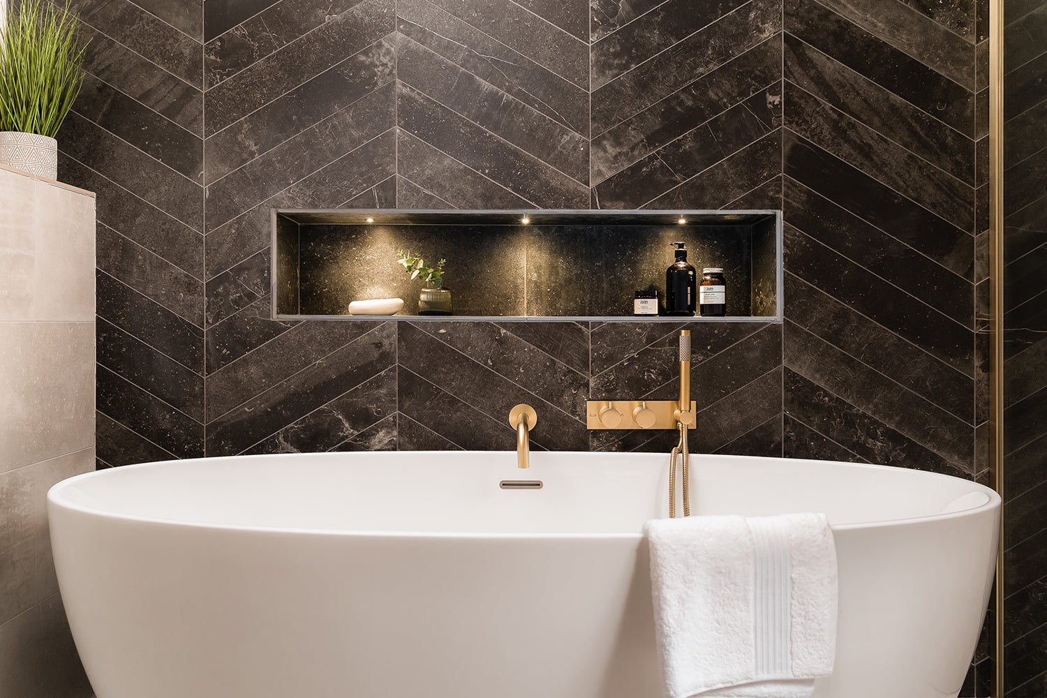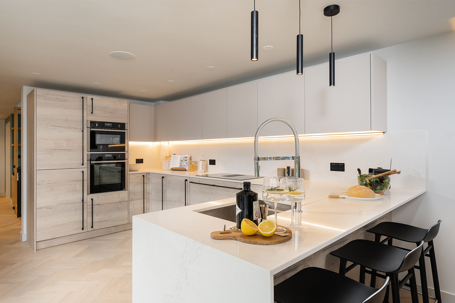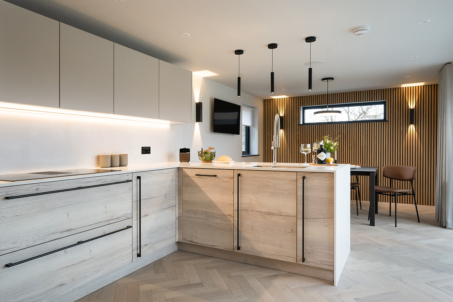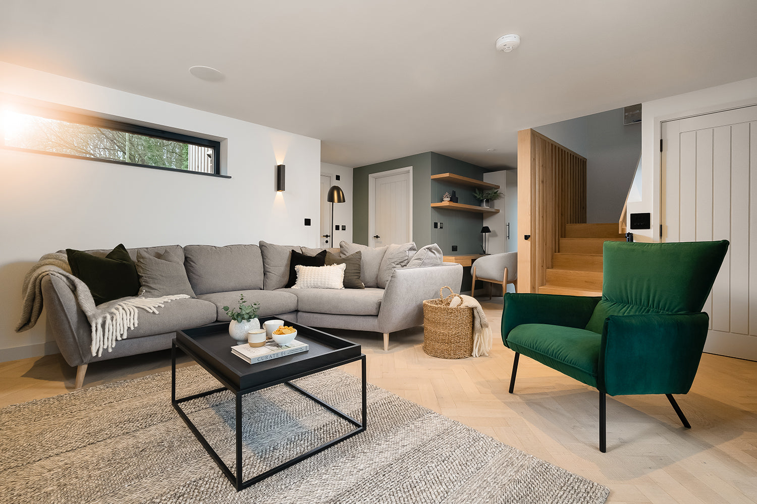 A comprehensive range of finishes were chosen as by our interior design team located in our Hayle headquarters. The scheme included the contemporary bathrooms (we adored the rich Herringbone tiles), chunky timber staircase, bespoke carpentry throughout, fixtures & fittings such as the super on trend Acupanel wood cladding system. A high-end custom kitchen was also designed in-house, made by our German manufacturers, AGKU and installed by our highly skilled tradesmen.
