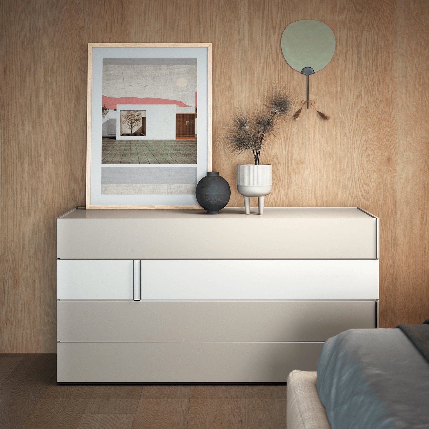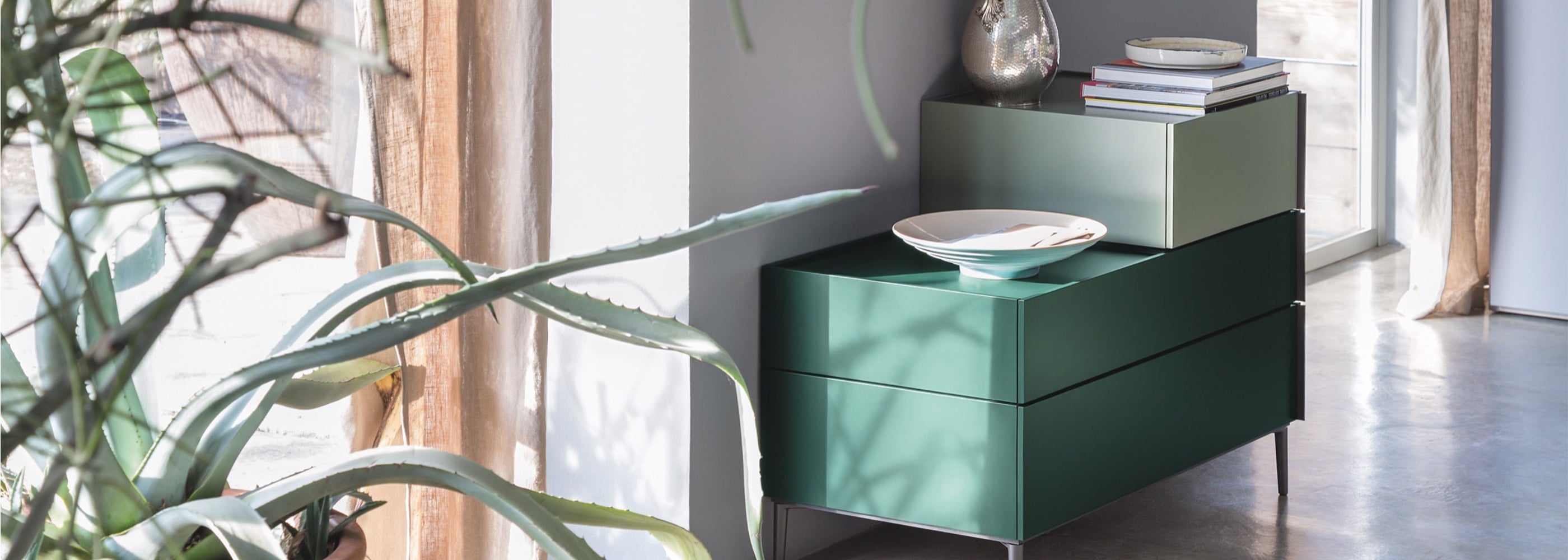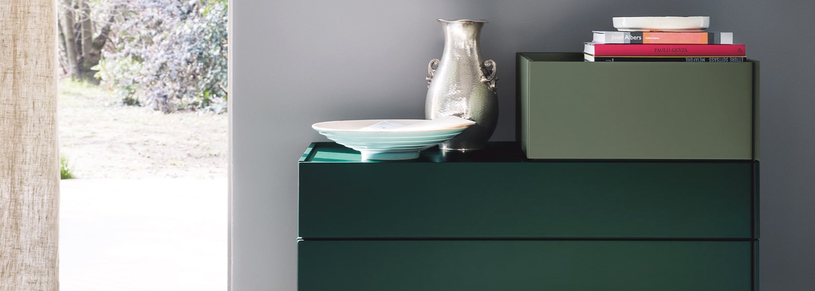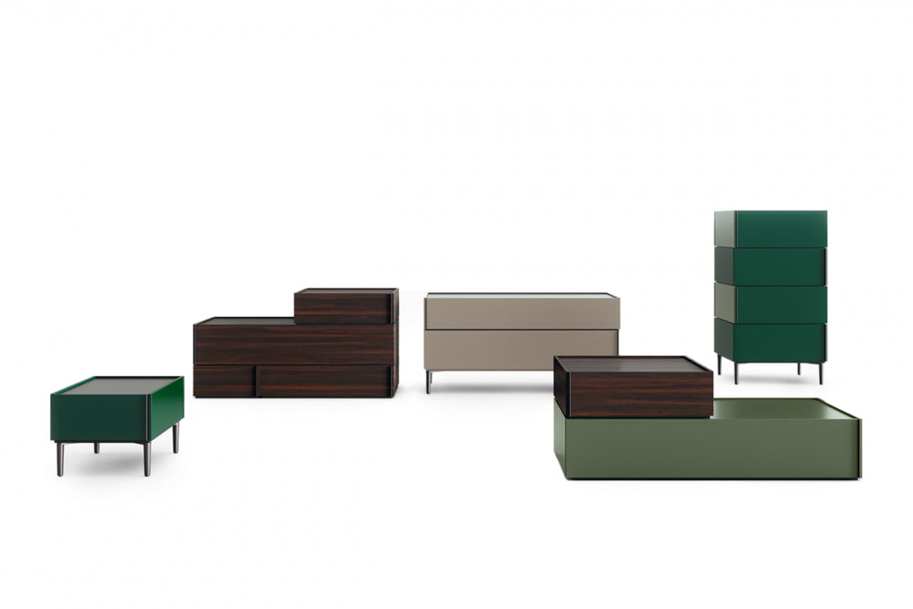 It offers virtually unlimited options as the structure and fronts come in different finishes and colours that can be mixed and matched, creating a pleasing graphic effect with a run of broken lines that continuously intersect the vertical lines accentuated by the small metal handle. Designed as a freestanding unit to sit in the middle of the room – in the bedroom, inside the walk-in wardrobe or in the living area – Giro-Giro System is just as functional set against a wall, standing on legs or directly on the floor.