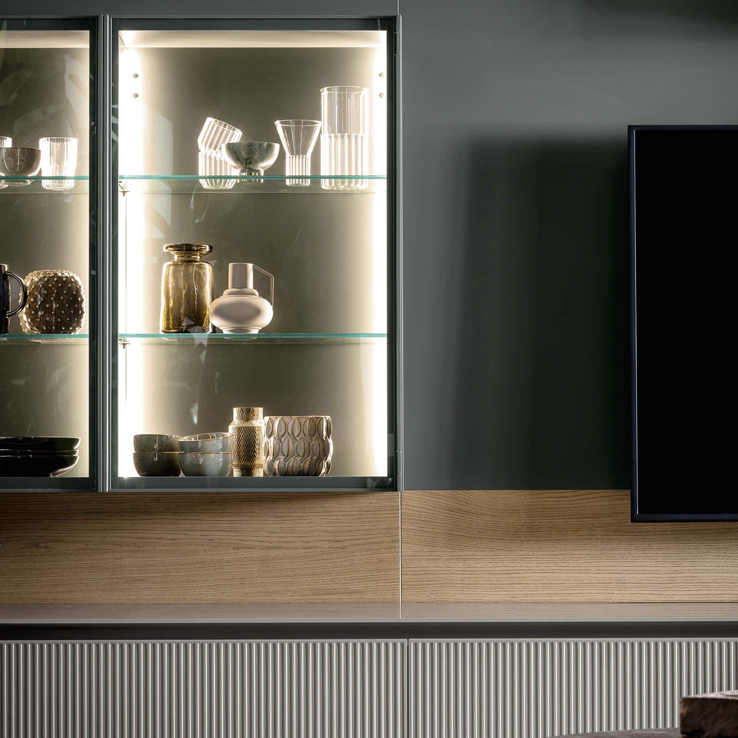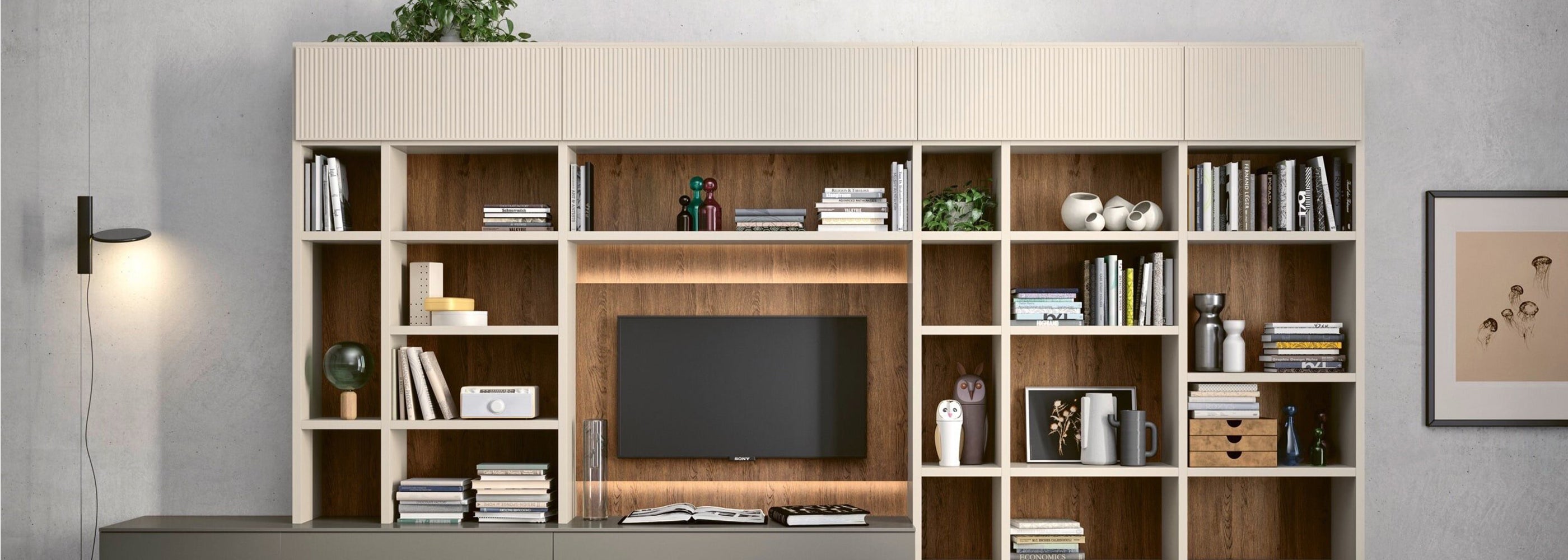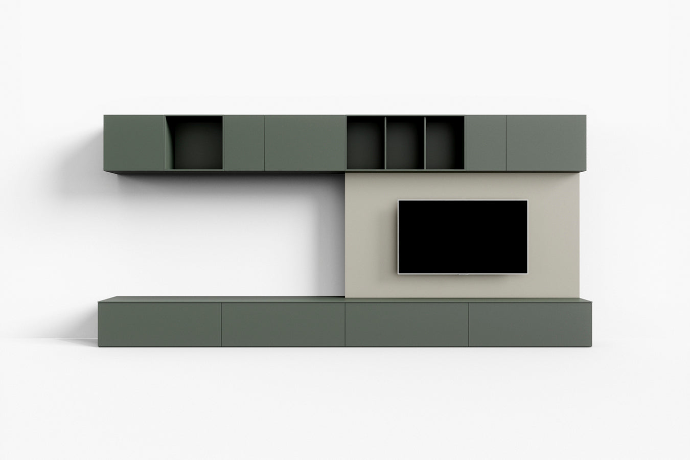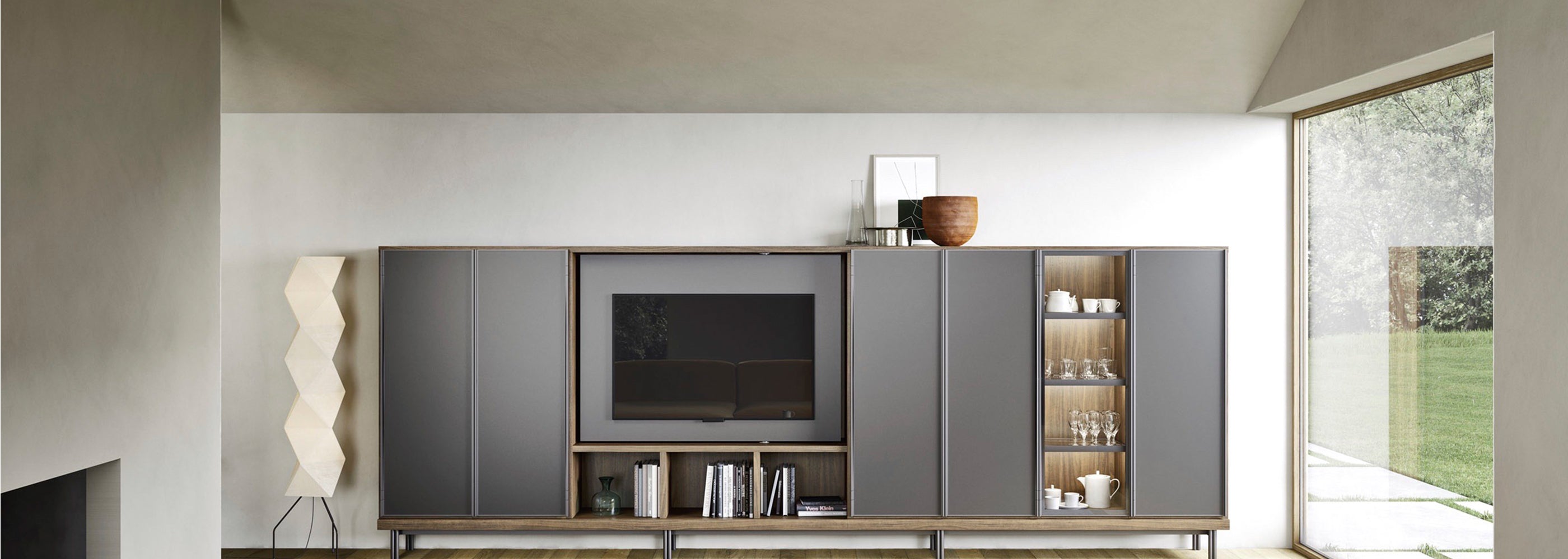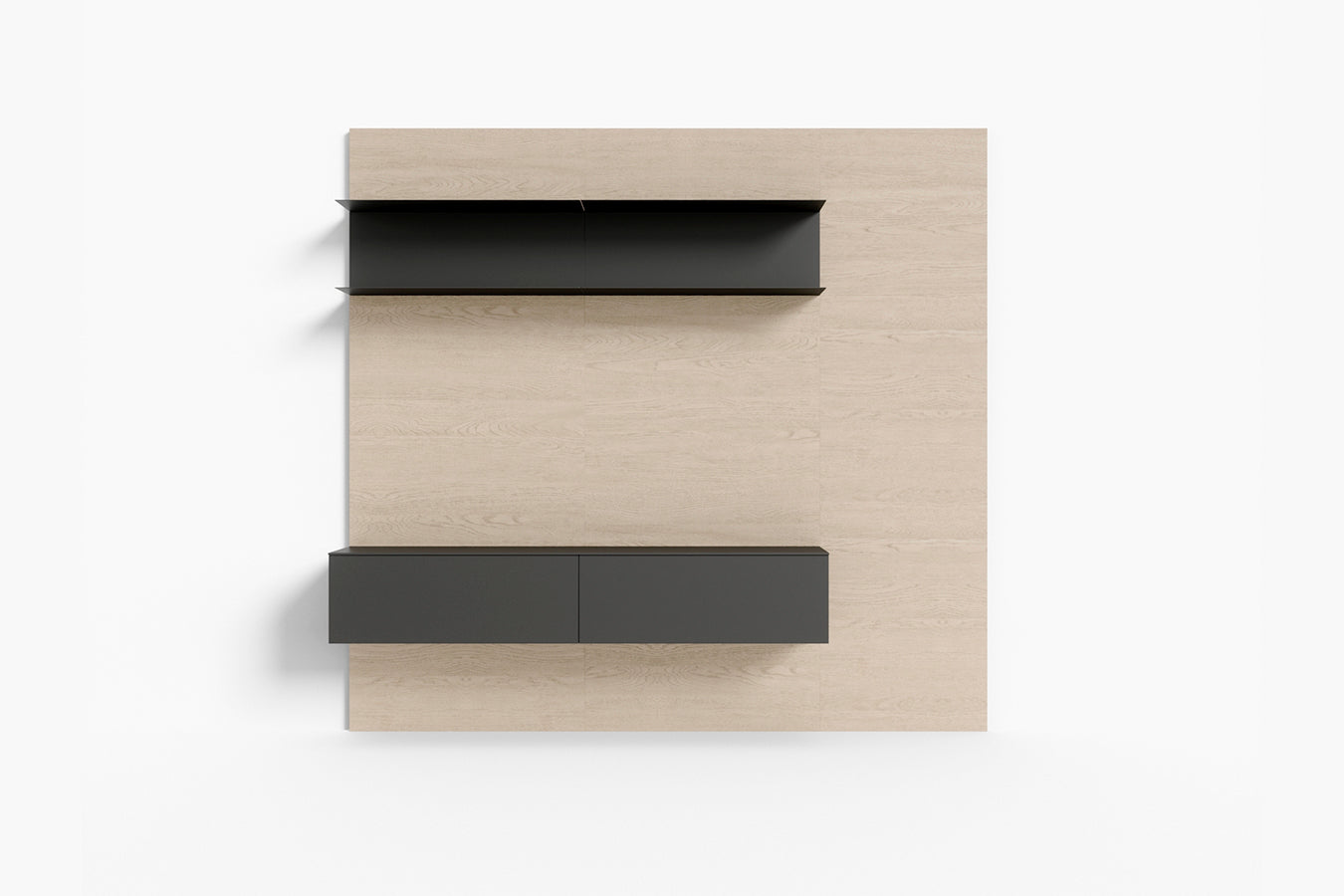 The various TV mounting panel models can be paired with storage units, side shelving, or sliding doors, with a range of finishes to choose from.