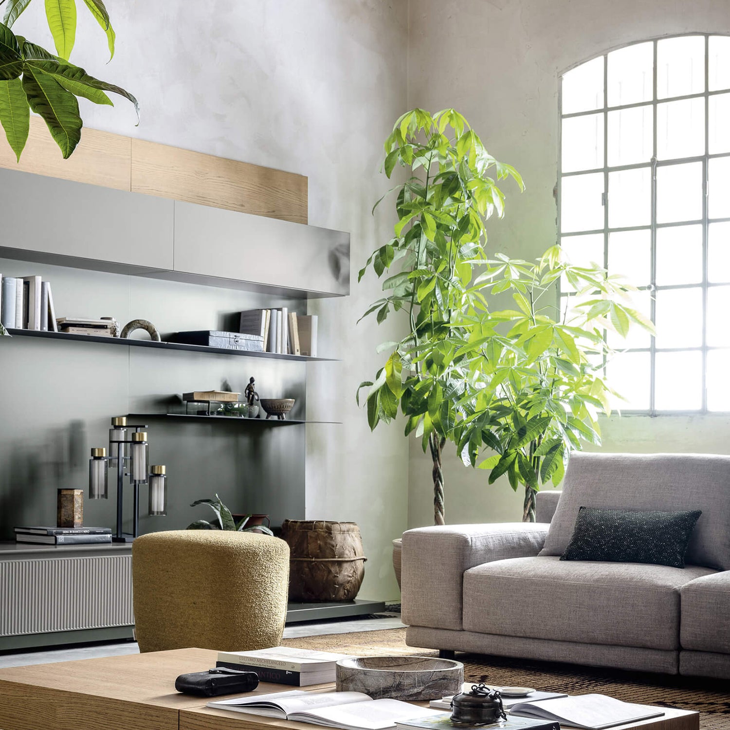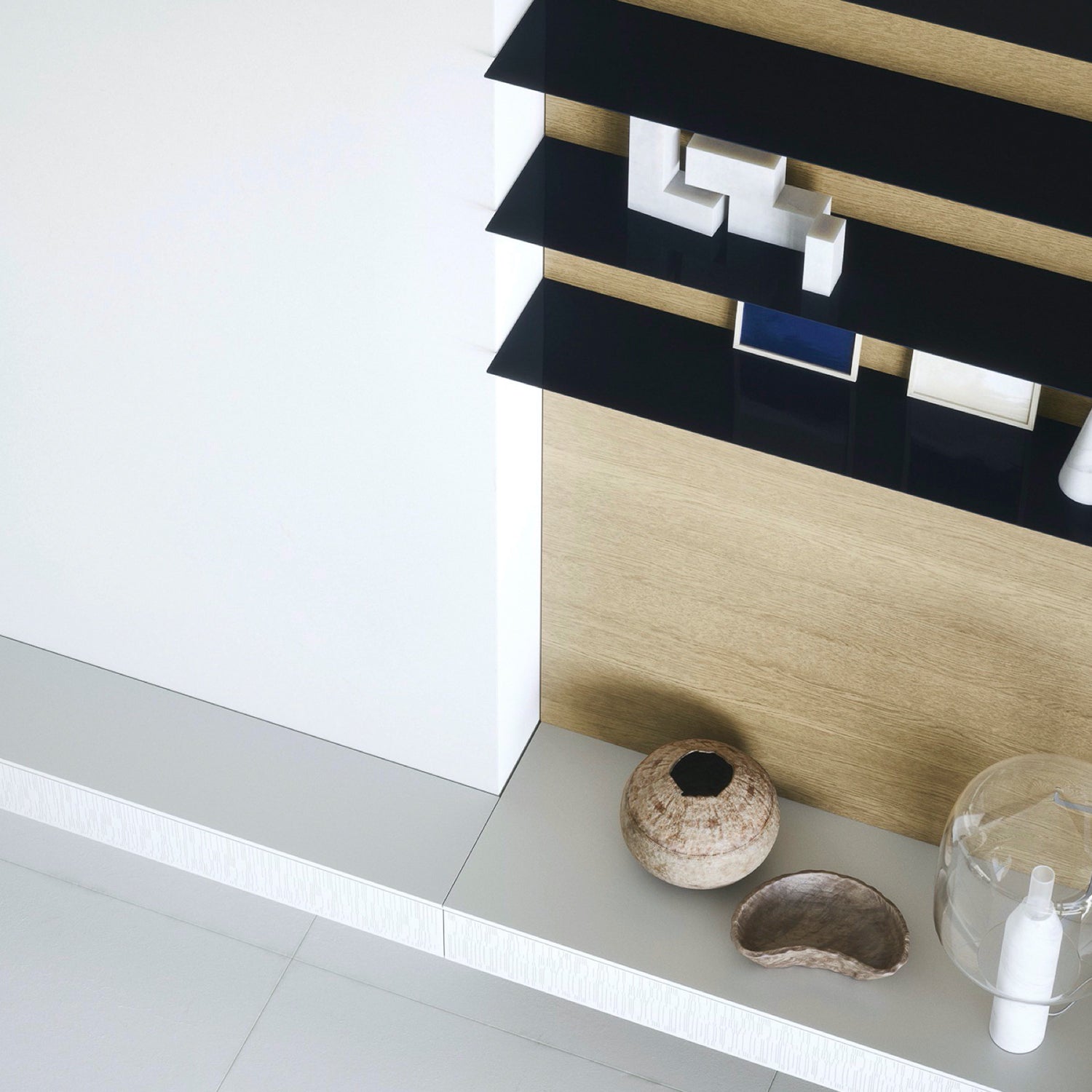 The wall paneling comes in two different thicknesses and can be fitted with shelves or storage units, creating different arrangements each time.